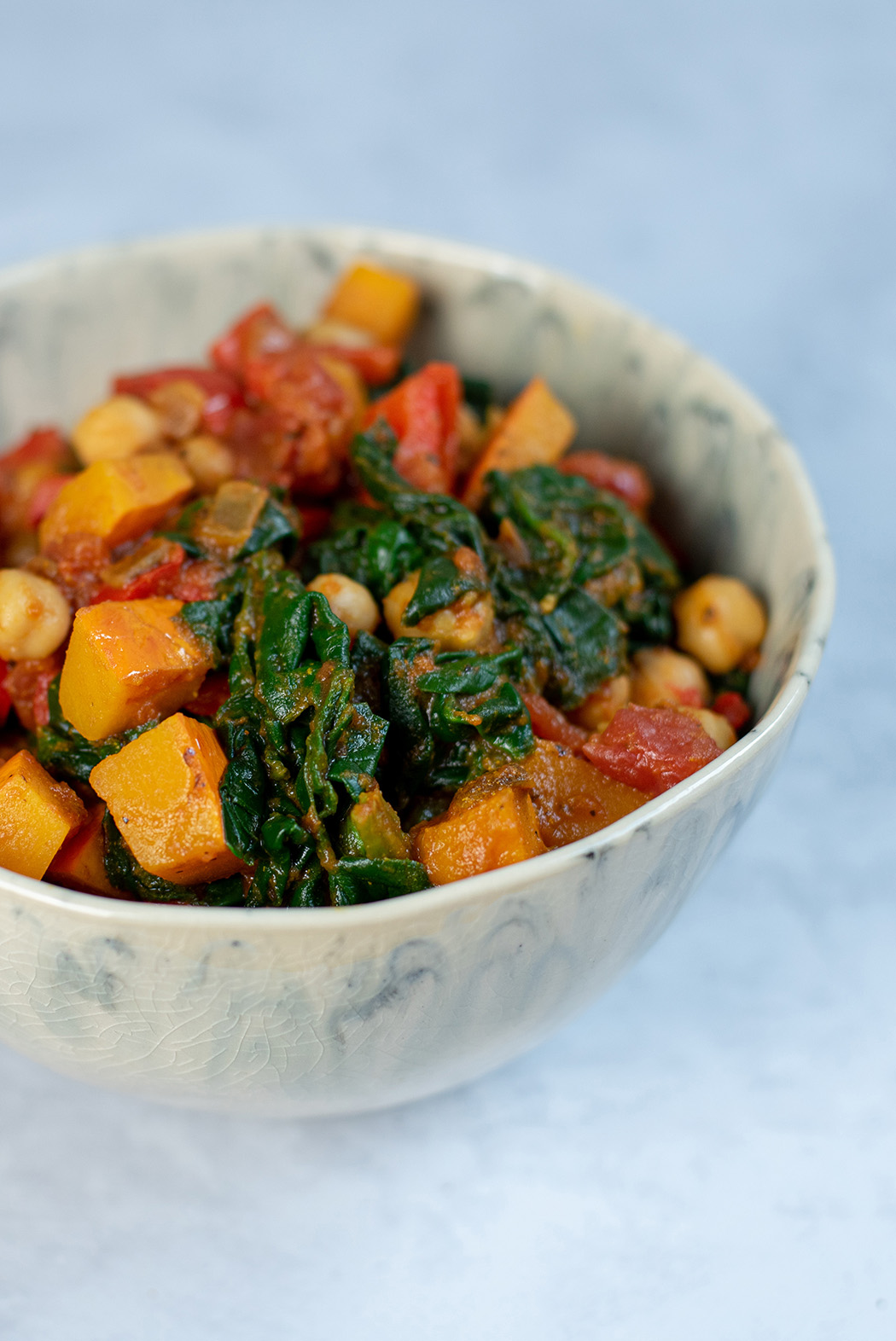 Das herbstliche Kürbis-Curry mit Kichererbsen und Spinat ist …