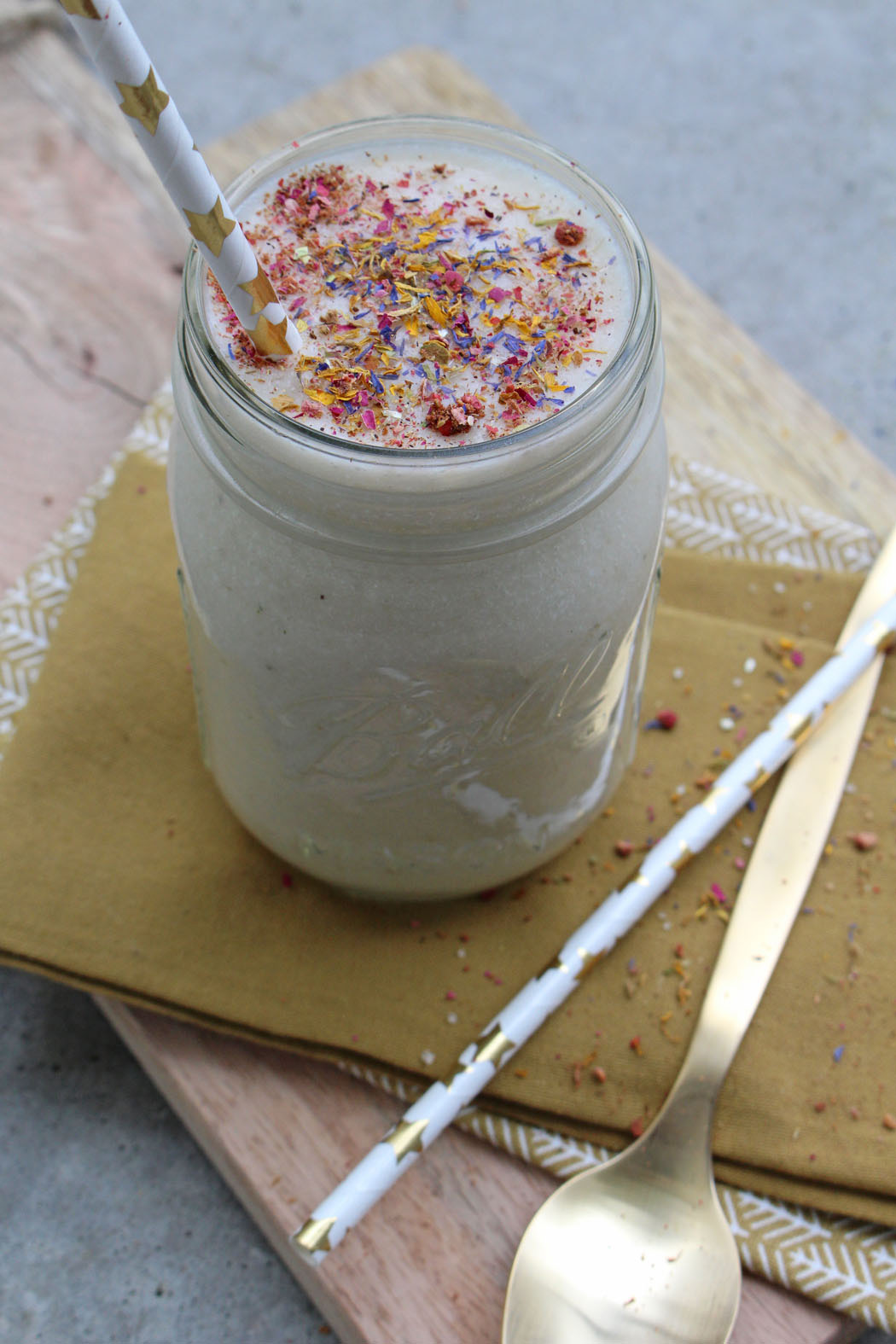 Dabei handelt es sich um einen weißen Smoothie mit Banane, Kokos, Hanfsamen und Maca-Pulver. Als Topping habe ich – für den „Einhorn-Faktor” – zwei bunte Gewürz-Blüten-Mischungen über das Getränk gegeben: Meinen all time favorite „Alles Liebe”*, bestehend aus rosa Pfeffer, Erdbeeren, Himbeeren, Vanille und Koriander. Die blauen und gelben Farbtupfer stammen aus der Blütenmischung „Flower Power”*. Diese Mischung enthält Vanille, Ingwer Nelken, Zimt, Rosenblüten, Ringelblumen, Kornblumen und Sonnenblumenblütenblätter.