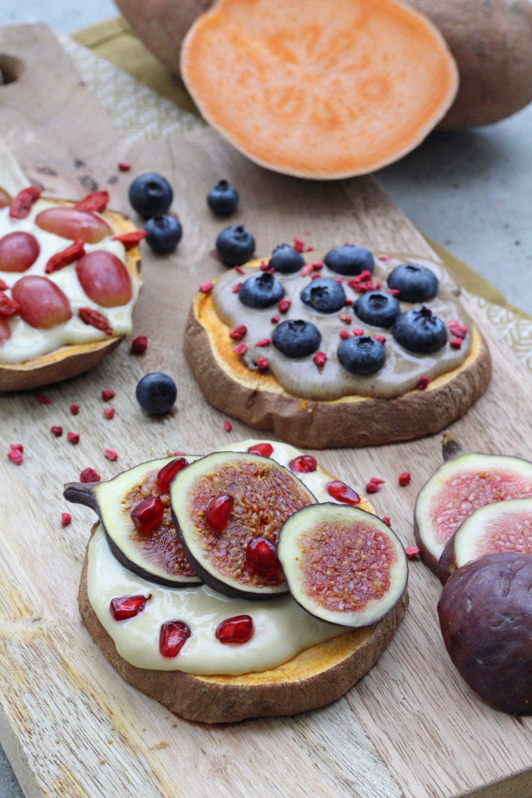 - Jede Süßkartoffelscheibe mit je 1 EL Walnuss- oder Mandelmus bestreichen. Mit Heidelbeeren, Trauben, Feigen, Granatapfelkernen, Goji-Beeren und gefriergetrockneten Himbeeren garnieren.