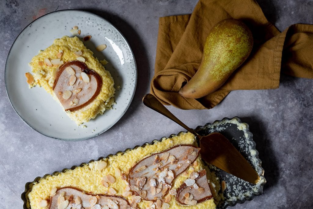 - Eine Tarteform mit 1 EL Kokosöl einfetten und die Hirse-Quark-Masse hineingeben. Dann die Birnenscheiben auf den Teig setzen und leicht eindrücken. Ca. 30 Minuten im vorgeheizten Ofen (MItte) backen (bei anderen Backformen kann sich die Backzeit verändern!).